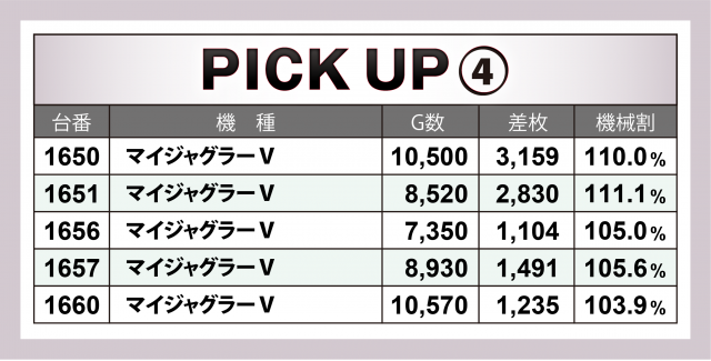 今回、[21.74円] スロでは全台トータルでマイナスに終わり、「英雄」取材無敗を続けていたのがこれでストップ。とは言え、微弱なマイナス分だっただけに次回はお釣りを付けて返せるはず。それよりも過去回に比べて評価ptが下がっている点が気になる。この辺も次回取材時に巻き返しを図りたいところだ。