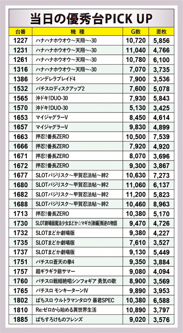 当日の最高記録となったは『SLOTバジリスク~甲賀忍法帖~絆2』1688番台+8,963枚だった。人気機種として盛り上げりを牽引しており、遊技していたファンの口角も上がっていたことだろう。他にも『押忍!番長ZERO』1677番台+7,273枚や、ノーマル機ながら『ハナハナホウオウ~天翔~-30』1261番台+6,100枚といった記録も見逃せない。他にも『ぱちスロ ウルトラマンタロウ 暴君SPEC』『沖ドキ!DUO-30』のように目立った活躍を披露する機種が多く、館内は灼熱に包まれていたと言っても過言ではないはずだ。