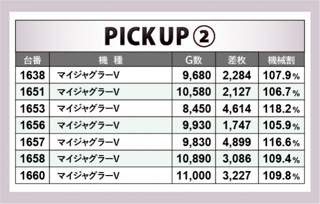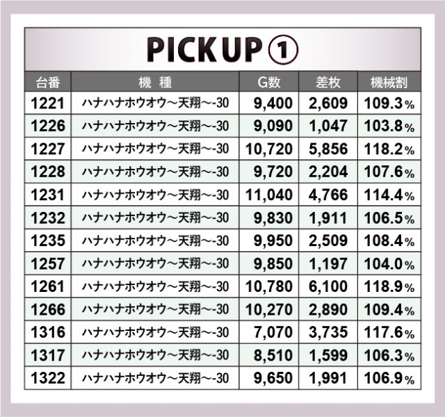 『ハナハナホウオウ~天翔~-30』は回転数と差枚数が比例するような数字になっているのが鮮烈だ。BIG連打によって1227番台+5,856枚や1261番台+6,100枚といった大きな記録が生まれており、これには遊技していたファンも大喜びしていたことだろう。それは『マイジャグラーV』も同様で、1653番台と1657番台から4千枚OVERが発生し、レバーを叩く力がかなり強かったと想像できる。