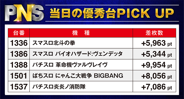 1501番台の「ぱちスロ にゃんこ大戦争 BIGBANG」と1537番台の「パチスロ炎炎ノ消防隊」も好記録。