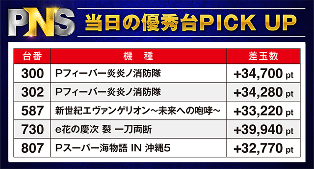 300番台と302番台の「Pフィーバー炎炎ノ消防隊」は、ともに+34,000ptオーバー。