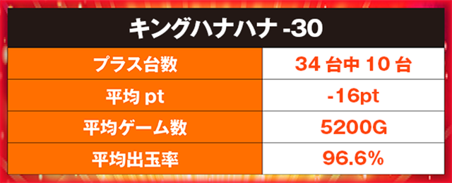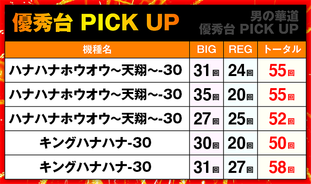 「キングハナハナ-30」と「ハナハナホウオウ~天翔~-30」のどちらにも、BIG回数とREG回数をバランスよく伸ばしている台があった。