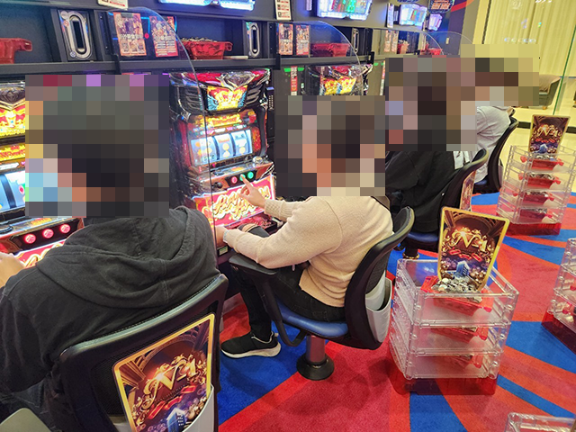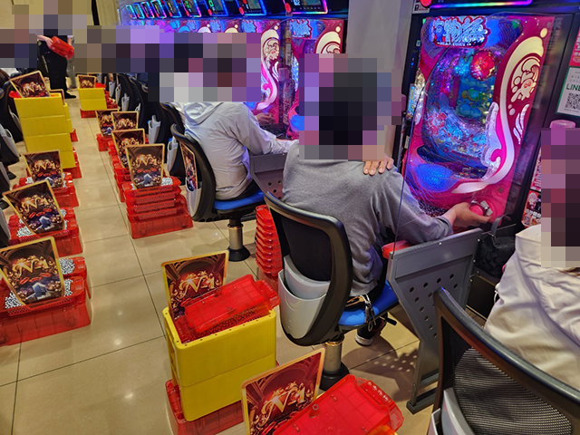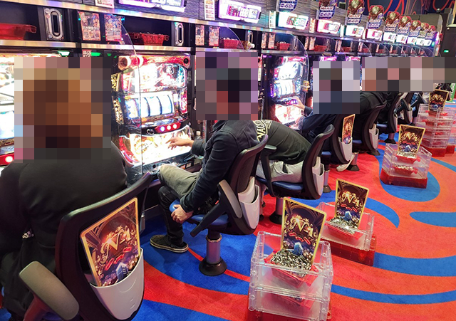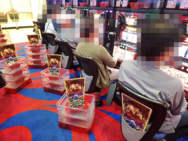 15時半過ぎの稼働率は80%を超え、半数以上の台は持ち玉が1箱以上。