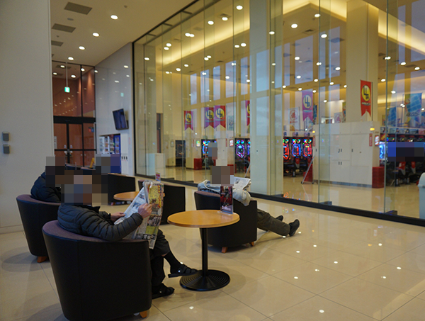 ガラス張りとなっているレストスペースも清潔。遊技の様子がみえるため、空き台を待つ時間に利用してみてもよさそうじゃ!