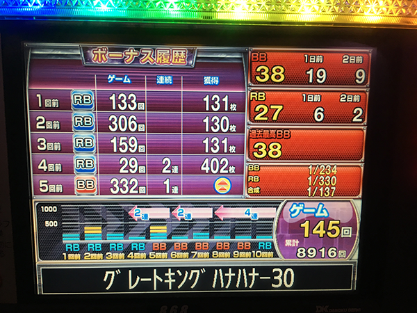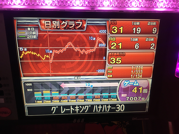 朝イチはハナハナシリーズが人気を集めていたことに着目し、実戦機種には「グレートキングハナハナ-30」をセレクト。