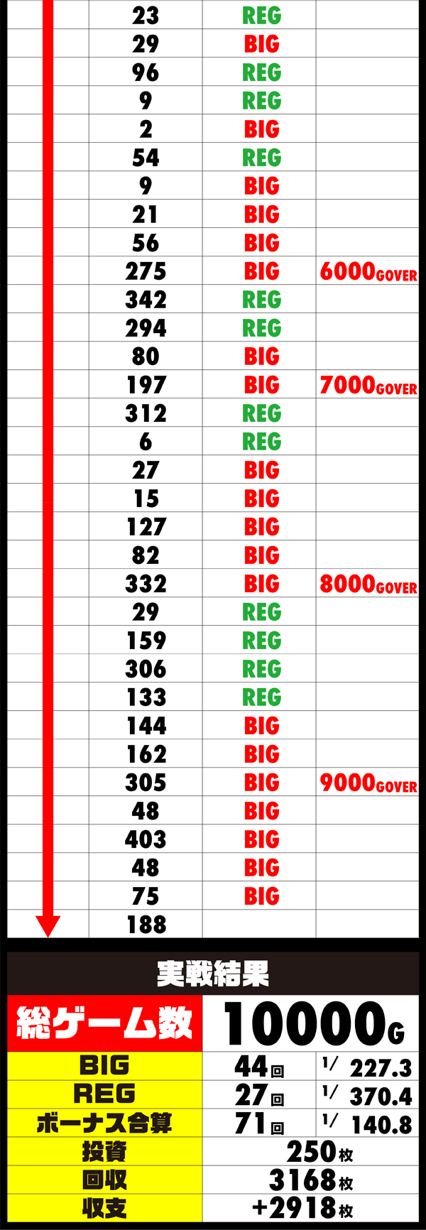 途中に800Gほどハマるシーンがみられたものの、追加投資をすることはなく、ベストな状態で1万回転に向かっていた。
