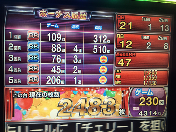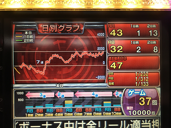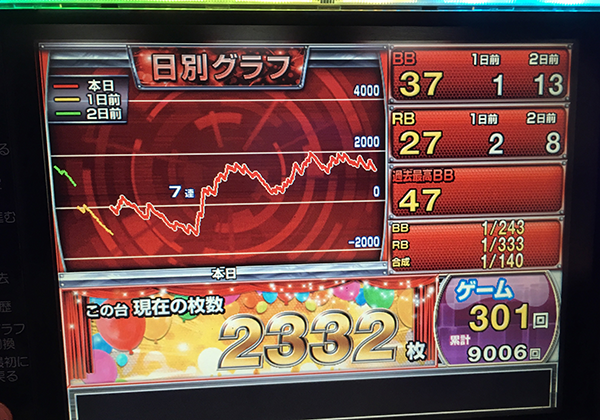 午後からはBIGを中心にテンポよくボーナスを引き当て、チャレンジ面だけでなく出玉面でも活躍。15時頃には総ゲーム数も4300Gに到達しているなど、まさに理想的といった展開で勝負は後半戦へと突入する!
