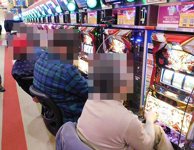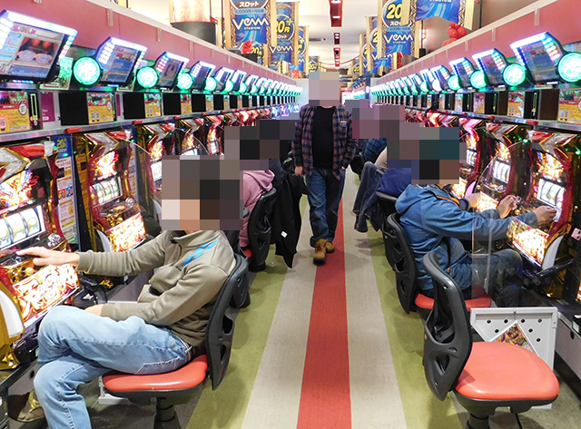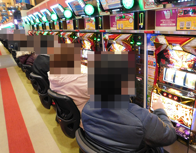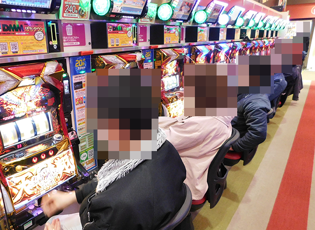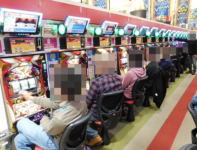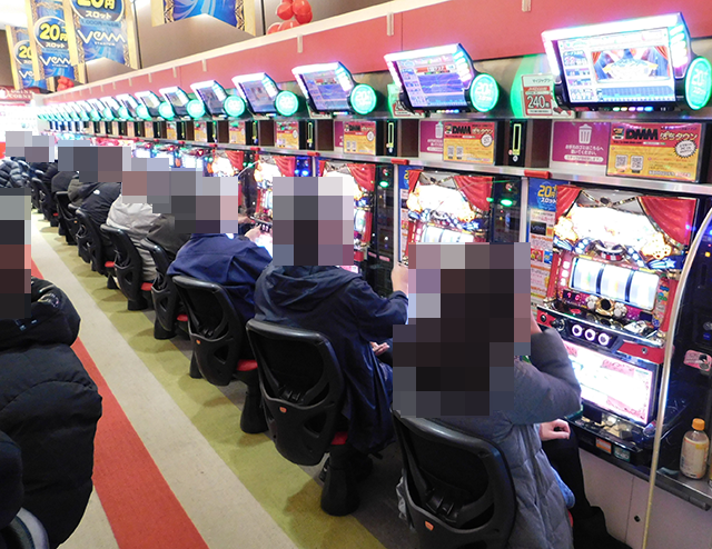 設置台数はホールで最多の27台であり、16時頃は8割ほどが埋まっていた。