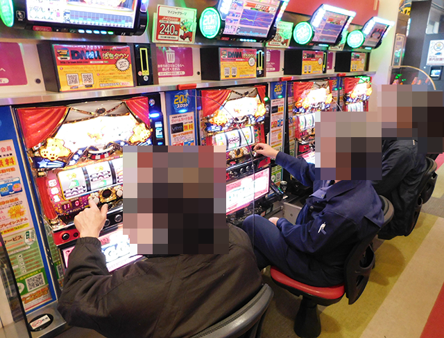 夕方頃のパチスロでは、沖スロとジャグラーシリーズでたくさんの笑顔がみられた。