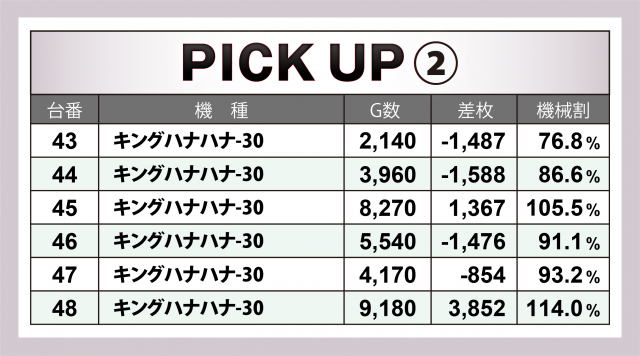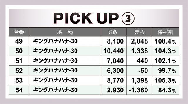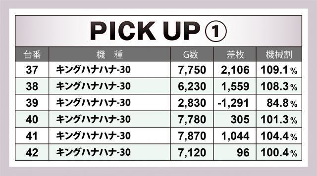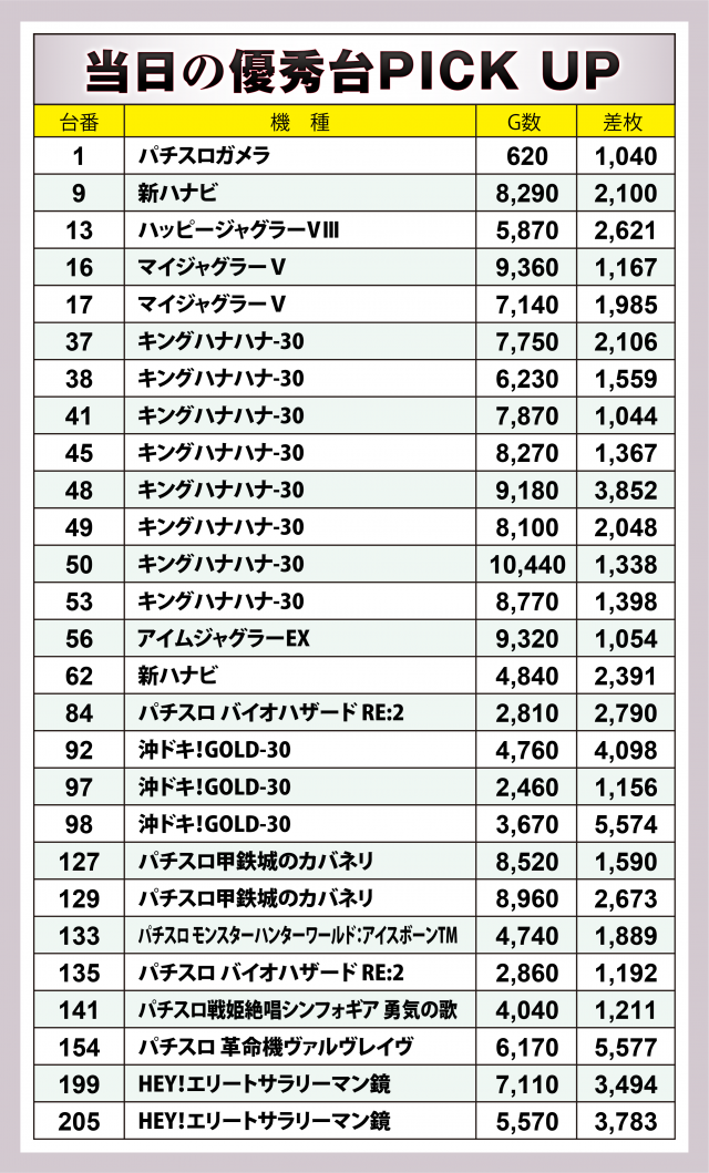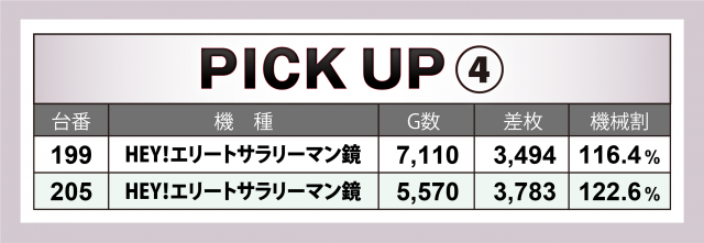 続いては当日好調だった2機種計20台にズームイン。『キングハナハナ-30』は設置18台全てが横並びで好況で、マイナス台を出しながらも+4千枚弱の台を輩出した。また『HEY!エリートサラリーマン鏡』は+3千枚オーバーが2台というハイスコアをマーク。