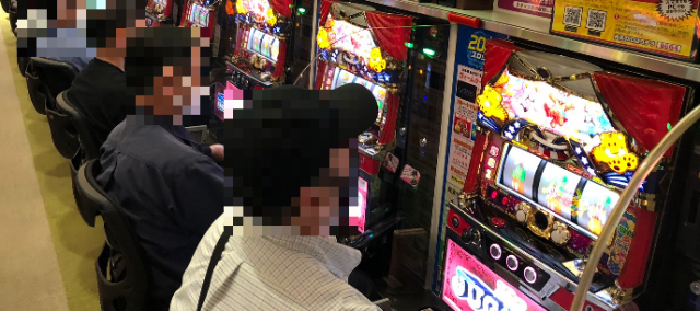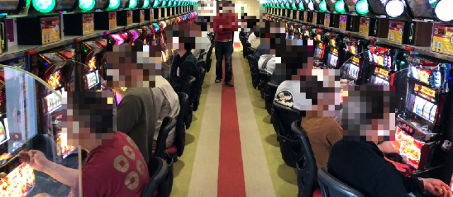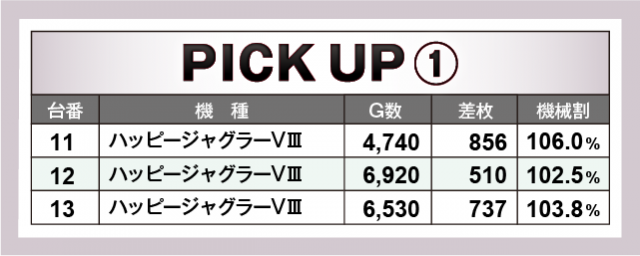 続いては当日好調だった4機種をチェック。老若男女問わず人気な『ハッピージャグラーVIII』『マイジャグラーV』『アイムジャグラーEX』とジャグラーシリーズの活躍が目立ち、マイナス台を含みつつも中でも15番台の『マイジャグラーV』では+3千枚オーバーを輩出した。また、『キングハナハナ-30』が12台の横並びで好況ぶりが窺え、トータル差枚数は+1万4千枚オーバーを獲得し、島全体が熱気に満ちていた。