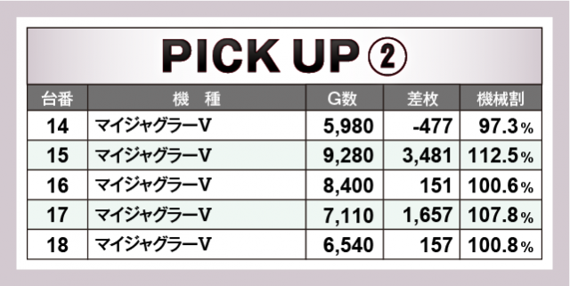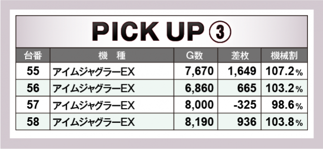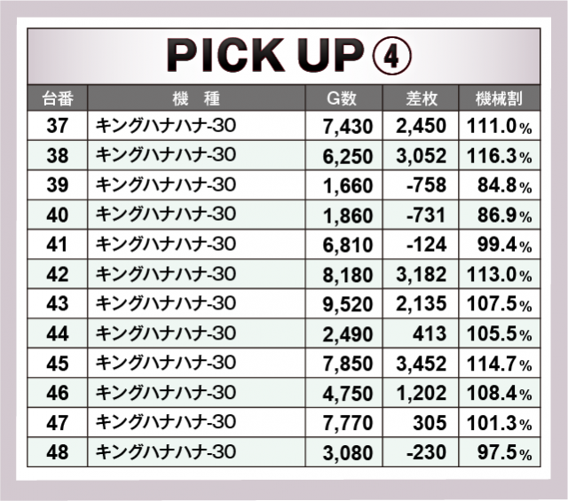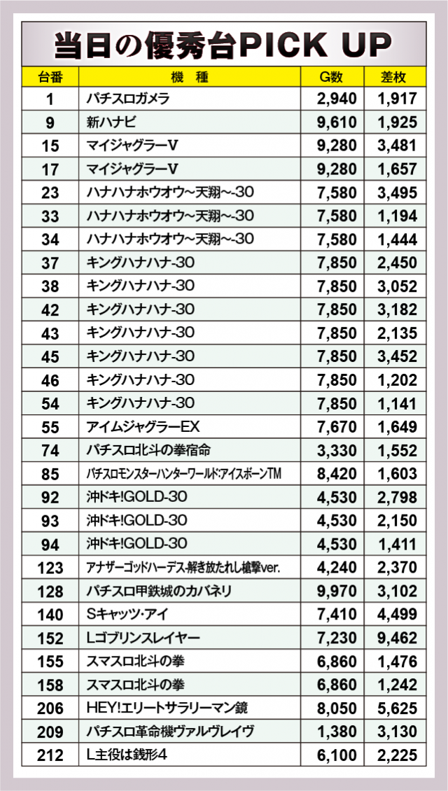 まずは優秀29台のPICK UPから。29台のうち16台が差枚数+2千枚以上を達成、+3千枚以上は10台、+4千枚以上は3台となった。後述する好調4機種以外では、152番台の『Lゴブリンスレイヤー』で+9,462枚を獲得し、この日のトップ差枚数をマークした。次いで、206番台の『HEY!エリートサラリーマン鏡』で+5,625枚、さらに140番台の『Sキャッツ・アイ』で+4,499枚が光っていた。