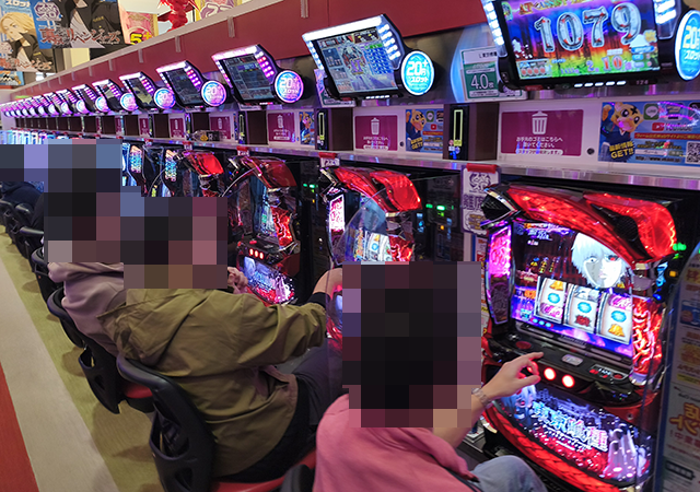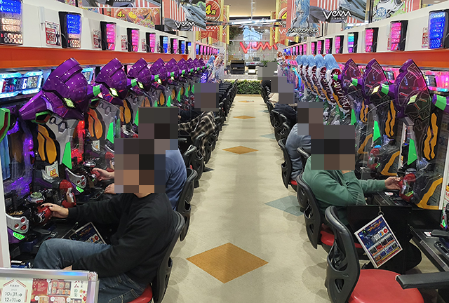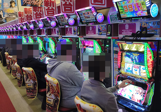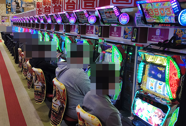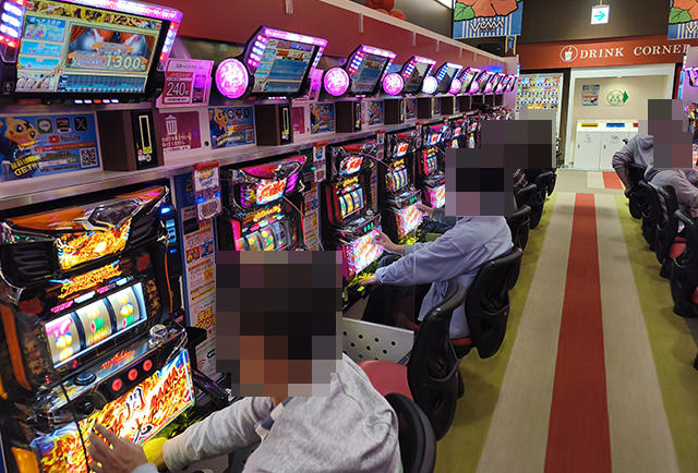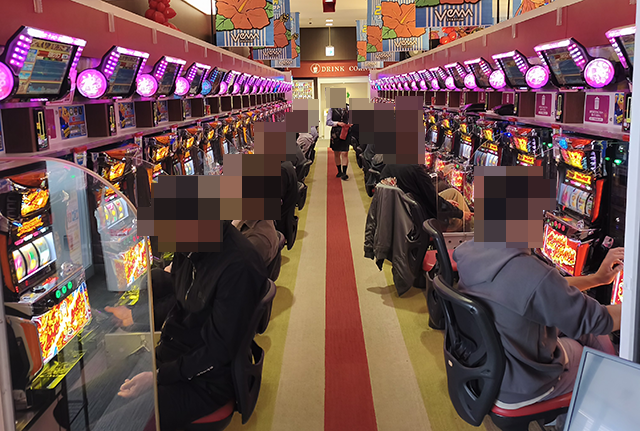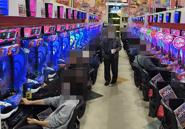 取材時はたくさんのプレイヤーが集まっており、パチンコとパチスロの両方がにぎわっていた。
