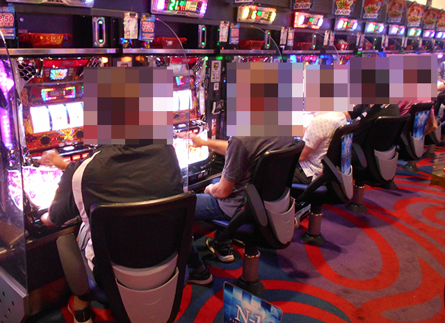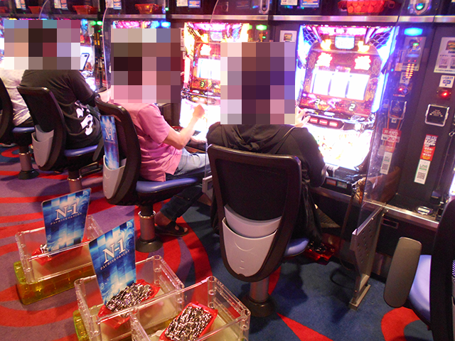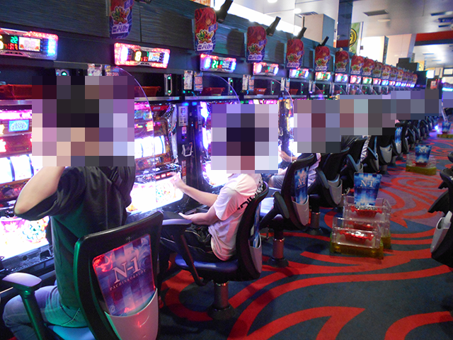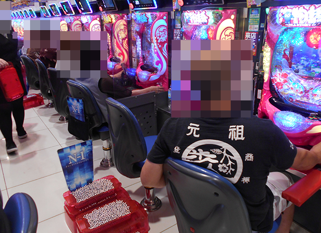 取材時に座っていたのは7名。なかには、3箱の持ち玉で遊技をおこなっている姿もあった。
