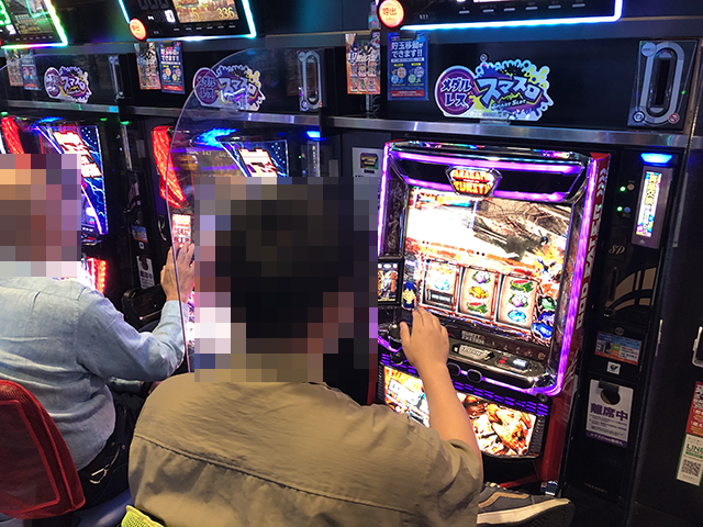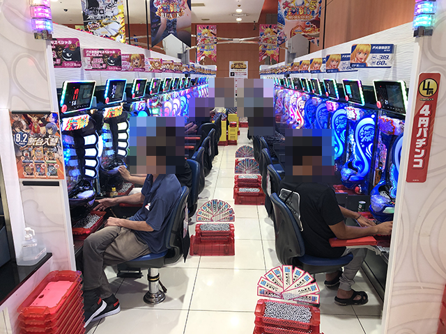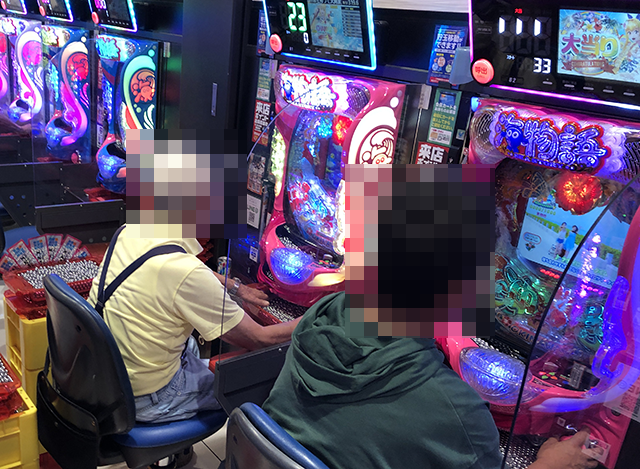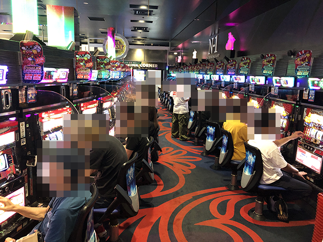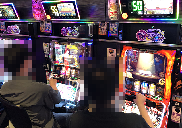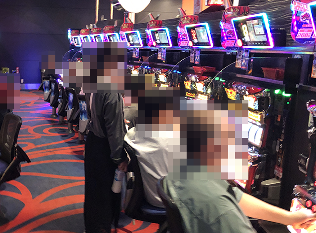 パチンコとパチスロの両方で、プレイヤーたちは楽しそうに遊技中。