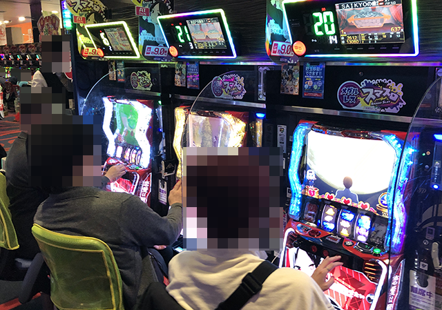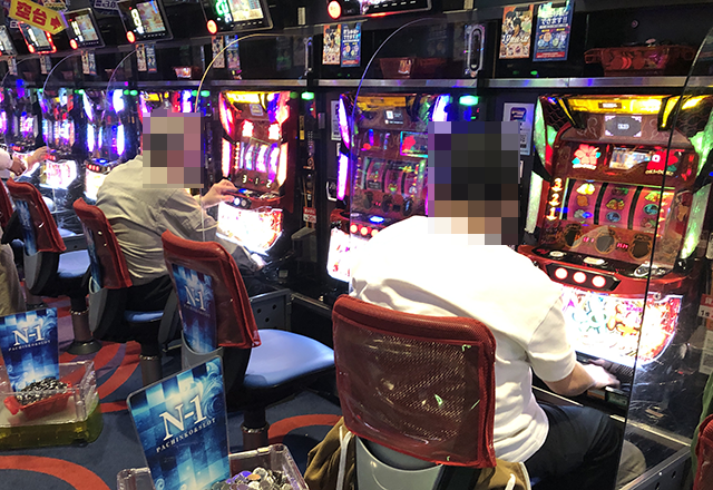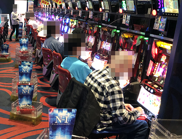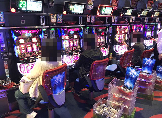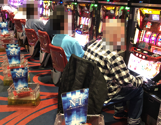 稼働中の7台のうち、2箱以上の持ち玉を使って遊技している台が6台あり、シマ内は活気に満ちていた。