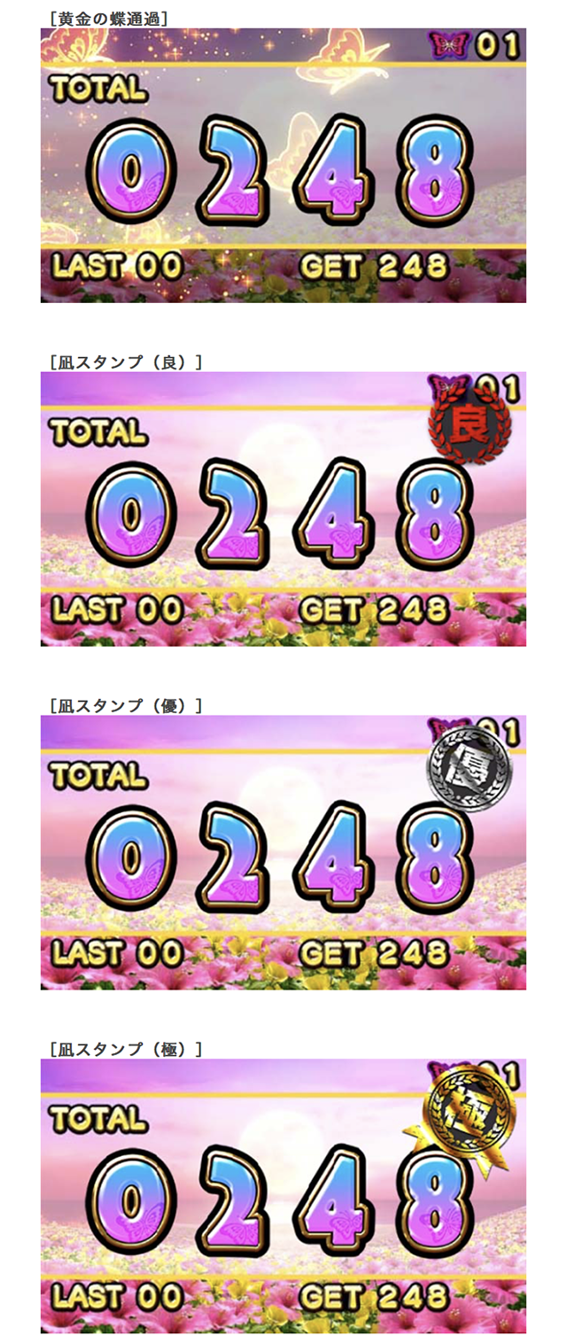また、ボーナス終了後のサブモニターにも注目。黄金の蝶通過であれば設定2以上、凪スタンプが押されれば設定4以上が濃厚となる。