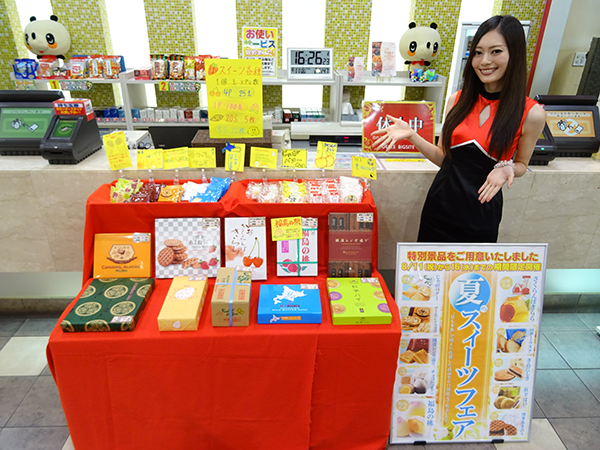 賞品コーナーをみてみると、夏のスイーツフェアと書かれた看板を発見。隣には全国各地のお菓子が並んでおり、つかさちゃんも興味津々といった様子であった。