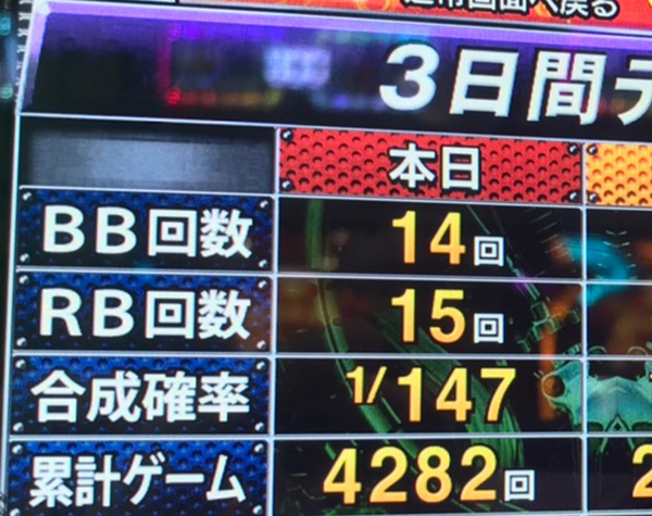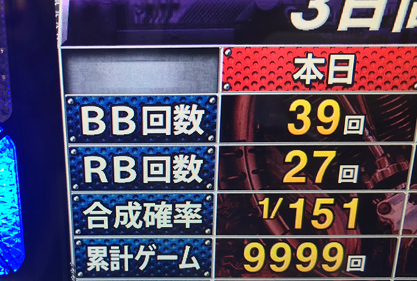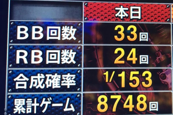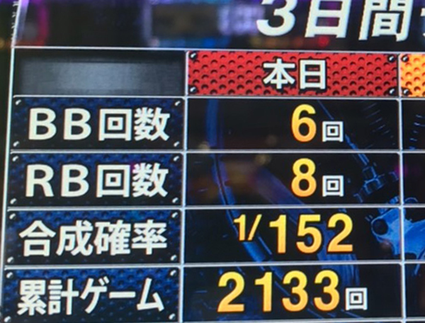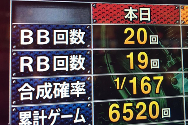 折り返し地点の5000Gを過ぎてからも疲れをみせずにレバーを叩き、18時頃には6500Gを突破。ボーナス回数も順調に増やしていき、夕方頃にはダブル達成に期待できる状況となっていた。