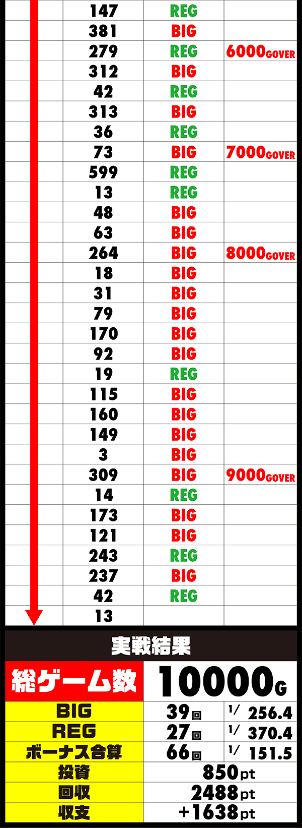 700Gを消化するあいだに8回連続でBIGを獲得するも、レバーを叩く速さでタイムロスをカバーし、着々とゲーム数を伸ばしていた。
