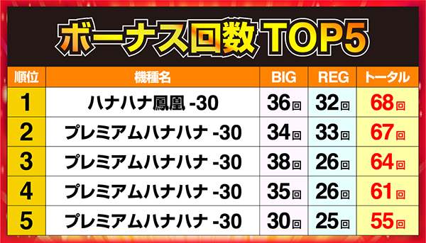 1位に輝いた「ハナハナ鳳凰-30」の1台はボーナス回数68回を記録!