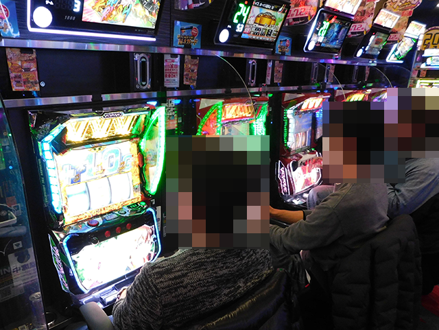 「パチスロ 革命機ヴァルヴレイヴ」と「スマスロ 北斗の拳 転生の章2」にも空き台はみあたらず、うれしそうに遊技をおこなっている姿が並んでいた。