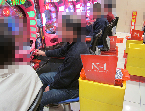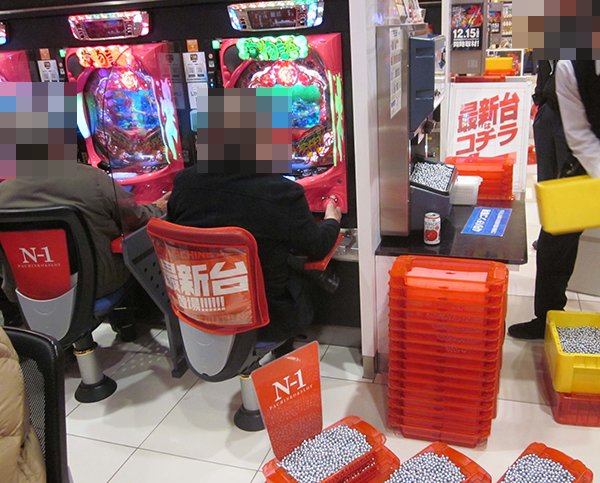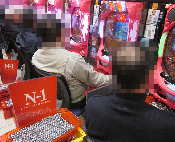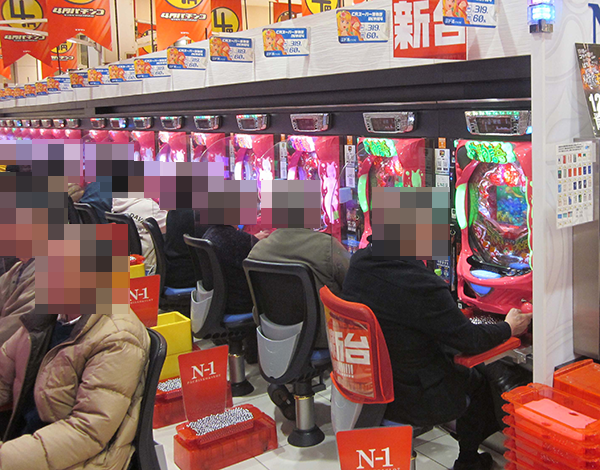 背中合わせに18台ずつ設置されており、シマ内は楽しそうに遊技をする姿で埋め尽くされていた。