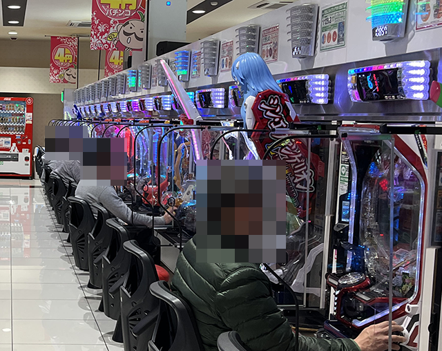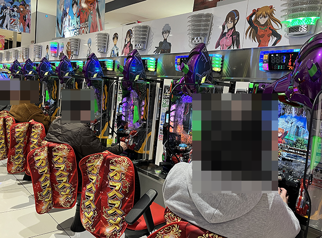 パチンコをみると、「新世紀エヴァンゲリオン~未来への咆哮~」が支持されており、シマ内からは華やかな雰囲気が伝わってきた。