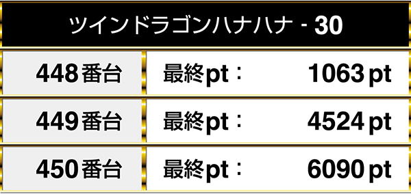 6000pt以上の台があった『ツインドラゴンハナハナ‐30』も3台が連なってプラスptを記録!