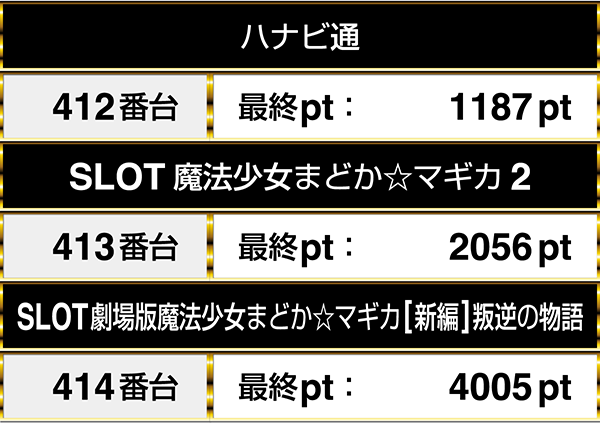 412番台の『ハナビ通』から414番台の『SLOT劇場版魔法少女まどか☆マギカ[新編]叛逆の物語』までの3台が並んで1000ptオーバー!
