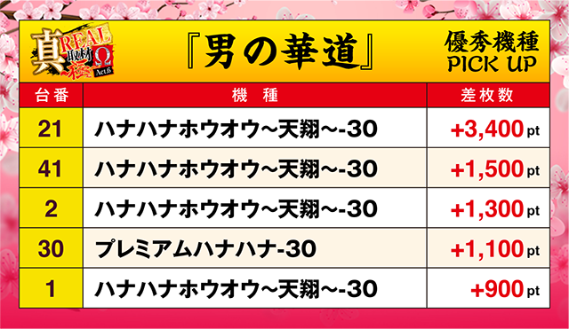 5割近くがプラスとなった「ハナハナホウオウ~天翔~-30」では、21番台が+3,000ptオーバー!