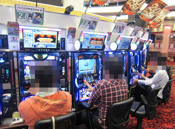 14時を過ぎた頃の20円パチスロでは、朝から注目を集めていた「バジリスク~甲賀忍法帖~絆」などが盛況となっており、充実感に満ちているような笑顔のプレイヤーも多数。