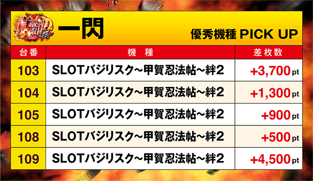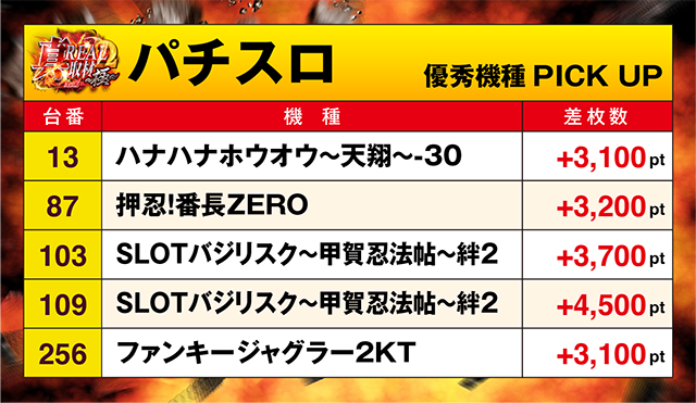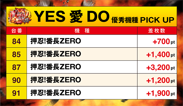 9台設置の「押忍!番長ZERO」は87番台の+3,000ptオーバーを含め、5台がプラス!