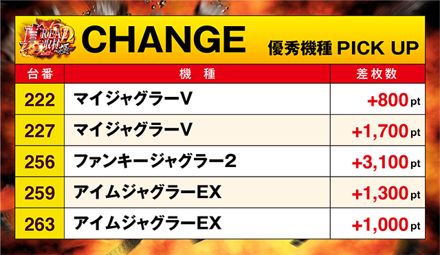 「ファンキージャグラー2」で、+3,000pt超の台を確認している。