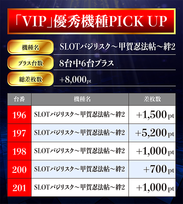196番台から201番台までの6台に笑顔が続き、197番台は+5,000ptを上回った。