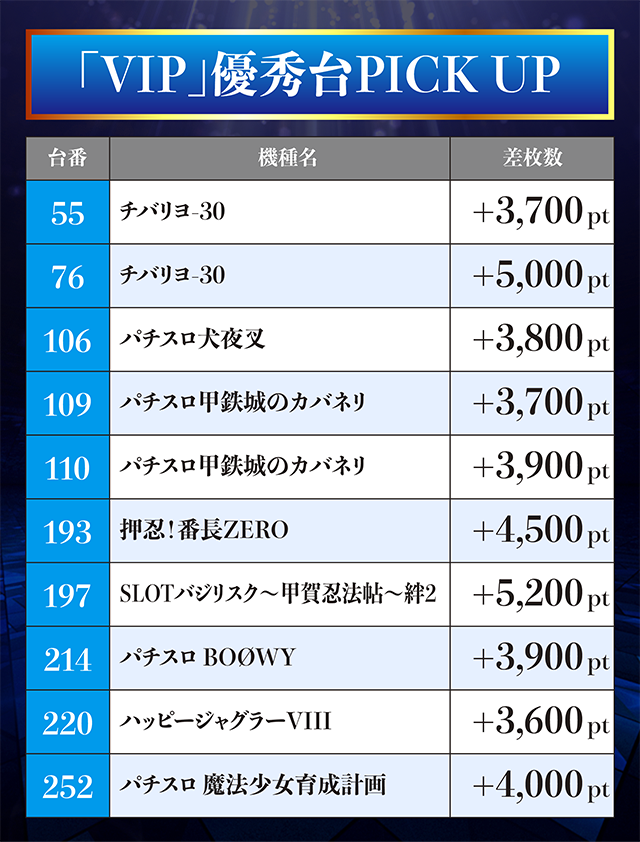 機種トータルで+9,000ptを超えた「チバリヨ-30」では、55番台が+3,700pt、76番台は+5,000ptを記録した。