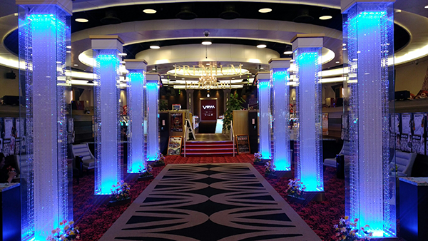 また、特徴的だったのが装飾である。青い光でライトアップされた柱が通路を囲むように設置されており、落ち着いた照明のおかげで、ホール内がいっそう華やかに映った。