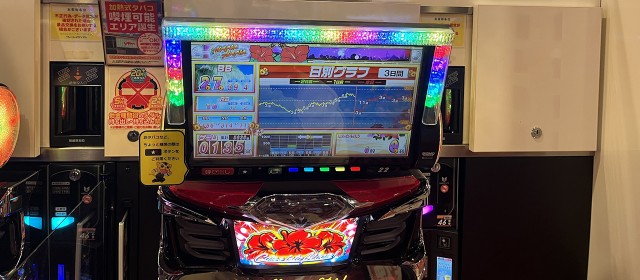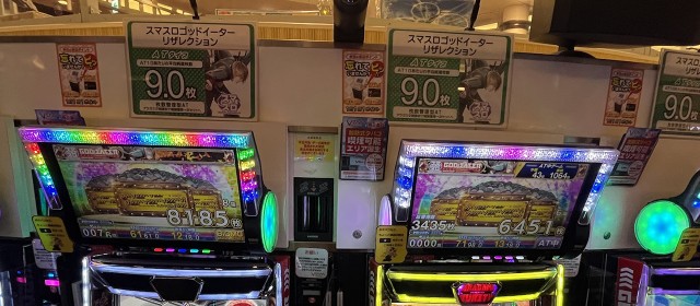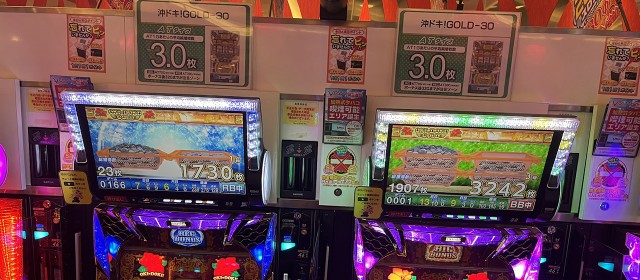 沖スロでは『沖ドキ!GOLD-30』『沖ドキ!BLACK』の沖ドキシリーズ、『スターハナハナ-30』『ドラゴンハナハナ~閃光~ 30』『キングハナハナ-30』『ハナハナホウオウ~天翔~-30』のハナハナシリーズと、いずれも台上カウンターには華々しい数値がズラリ。