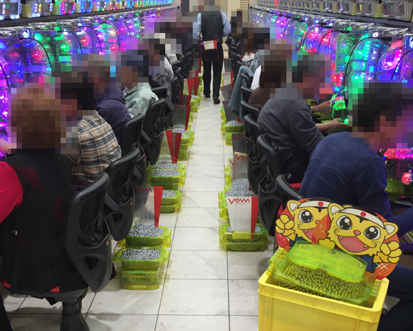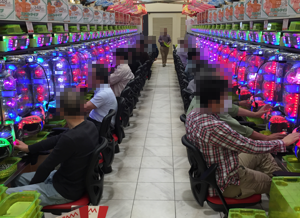 昼過ぎになると4円パチンコの「CR牙狼FINAL」と「CR大海物語3スペシャル」では9割以上の席が埋まっており、好調な台も多数見られた。嬉しそうな表情を見せ、納得した様子で打っている姿からも、期待通りの遊技が出来ていたことが伝わってくる。笑顔も他のシマと比べても多く、ひときわ輝いて見えた。