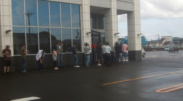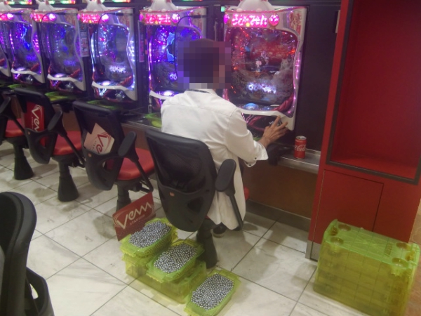 この日の朝イチは、小雨模様の天気で平日にも関わらず多数のプレイヤーが集合。スタッフの元気な挨拶に迎えられつつ、気分よく入店しているようにみえた。