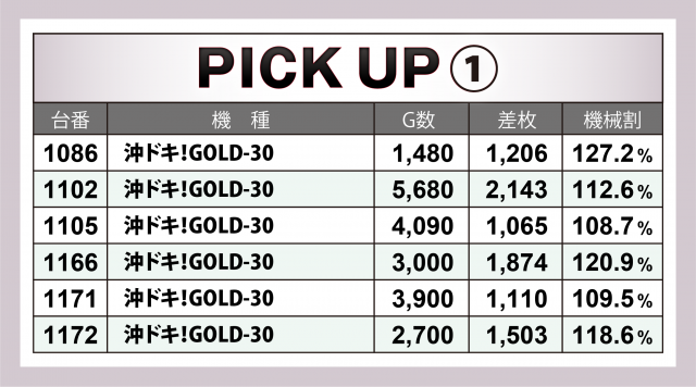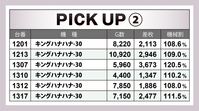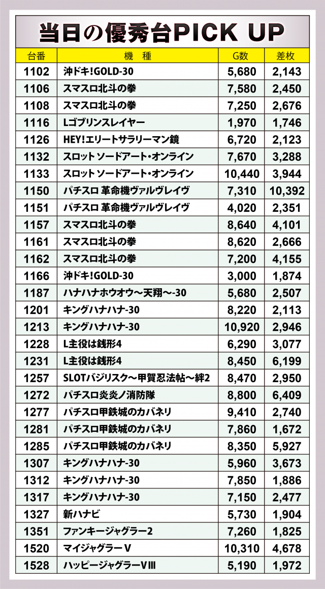 まずは優秀30台のPICK UPからお届けしよう。30台のうち8割弱となる23台が差枚数+2千枚以上を達成、さらに+3千枚以上は11台、+4千枚オーバーは7台、+5千枚オーバーは4台という結果となった。
