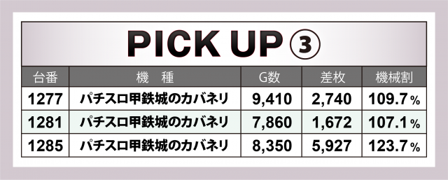 続いては好調3機種計15台にを追ってみよう。15台全てが4桁のプラス差枚数をを成し遂げ、最も高い差枚数の台を輩出したのが『パチスロ甲鉄城のカバネリ』。+6千枚弱を筆頭に3台トータル+1万枚達成目前となった。また『キングハナハナ-30』は+3千枚超×1&+2千枚超×3で6台の合計が+1万4千枚オーバーをマークした。