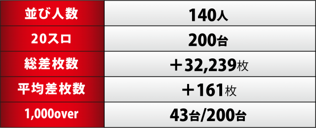 当日の[1000円/46枚]スロ200台のトータル差枚数は+32,239枚と、前回マイナスの悔しさを晴らす快勝を収めた。また、前回とほぼ同数に達した1,000overは全体の2割強と、他店取材と比べても遜色のない水準で終えることができた。連敗とはならずプラスに終わった今回の成績を弾みにして、次回取材で連勝かつ多大な差枚数を残すことができれば喜ばしい限りだ。