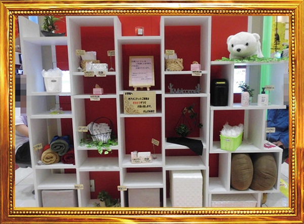 遊技スペースの近くには、ブランケットやクッションなどのアメニティグッズが用意されている。棚には装飾が施されているため、みためにもかわいらしく思えた。