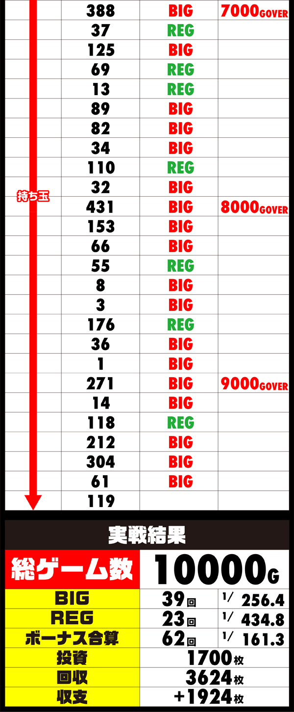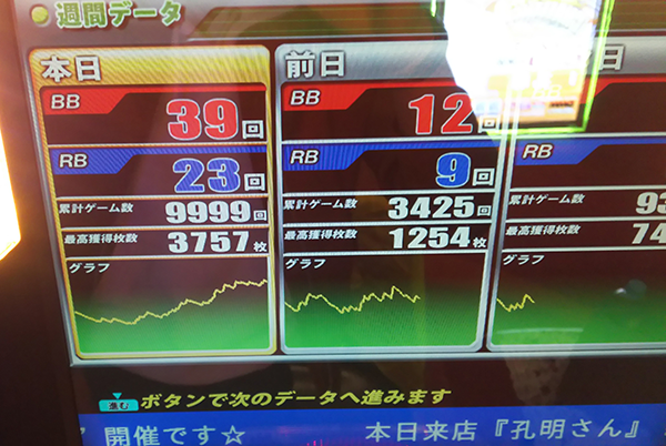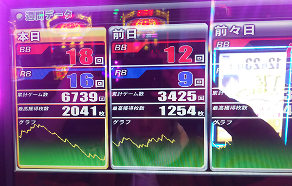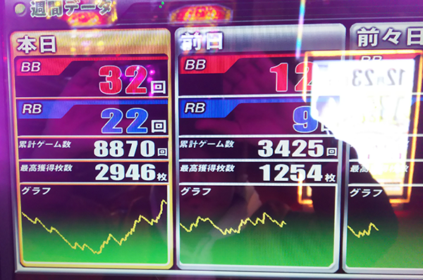 3600Gを越えた頃から大きくハマるシーンがたびたびみられ、追加投資をしてしまうも夕方過ぎにはBIG回数がグンッと増加。