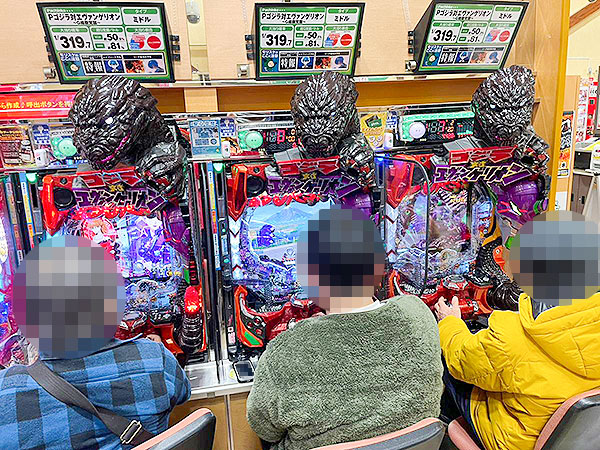 14時半ごろの200円/89玉パチンコを見ると「Pゴジラ対エヴァンゲリオン〜G細胞覚醒〜」や「新世紀エヴァンゲリオン〜未来への咆哮〜」が好評の様子。華麗なパフォーマンスを披露するプレイヤーを目撃している。