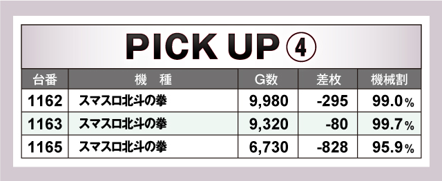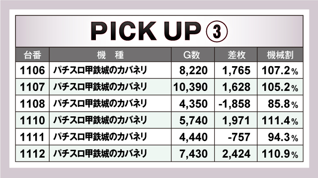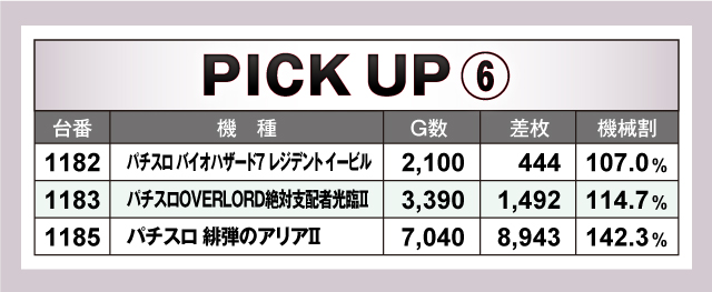 続いては、並びで賑わいを見せた6箇所を紹介。さまざまな種類の機種をピックアップしたが、特に注目なのは「パチスロ甲鉄城のカバネリ」で間違いないだろう。6台並びのうち4台がプラスで、プラス台はすべて4ケタオーバーのプラス! 平均差枚も+862枚と当日の盛り上がりを牽引していた。その他、上でも取り上げた1167番台「スロット ソードアート・オンライン」の+9,723枚を含む3台並び、1185番台「パチスロ 緋弾のアリアⅡ」の+8,943枚を含む3台並びなど、賑わう箇所が多数確認できた!