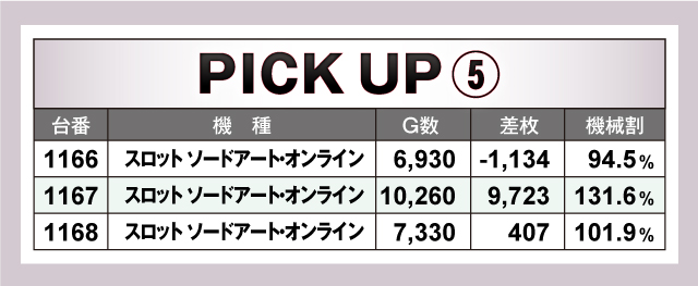 まずは優秀台23台の紹介から。+1,000枚以上だったのは23台。そのうち+3,000枚オーバーは8/23台、+5,000枚オーバーは3/23台で、最優秀台は1167番台「スロット ソードアート・オンライン」の+9,723枚と万枚近くの素晴らしい結果をマーク。全体を見渡すと、好記録をマークしている台はしっかり回されていたので、楽しめる環境はちゃんと用意されていた可能性が高そうだ!