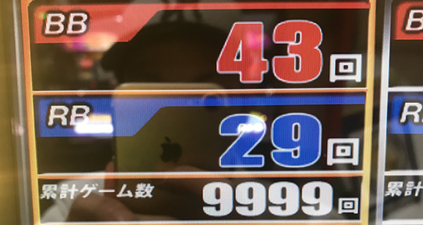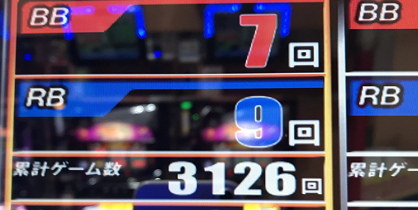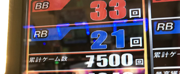 ボーナスを消化する時間が多くなるも、レバーを叩く速さでタイムロスをしっかりとカバーし、夕方頃には7500G突破。1万回転を達成できるペースを保ったまま後半戦に突入していた。