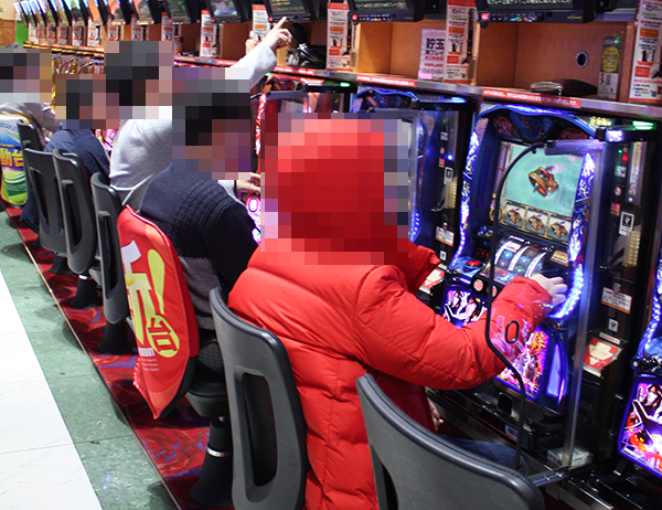 各台計数機や分煙ボードなど、優れた設備面に好感を抱きつつホール内を進んでいくと、「バジリスク~甲賀忍法帖~絆」にて、楽しげなプレイヤーがみられた。